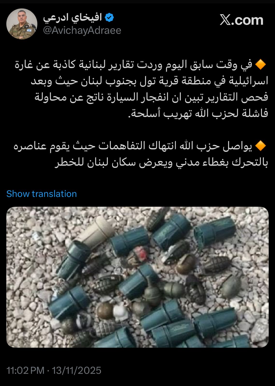 كتب المتحدث باسم الجيش الإسرائيلي أفيخاي ادرعي على منصة “اكس”: