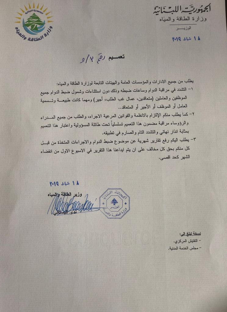 أصدرت وزيرة الطاقة ندى البستاني تعميماً طلبت فيه من كل الادارات والمؤسسات العامة والهيئات التابعة للوزارة التشدد في مراقبة الدوام وساعات ضبطه، وذلك من دون استثناءات لجميع الموظفين والعاملين.كما طلبت في التعميم الالتزام بالانظمة والقوانين المرعية الاجراء ومن المدراء والرؤساء مراقبة مضمون هذا التعميم واعتباره بمثابة انذار نهائي تحت طائلة المسؤولية.
