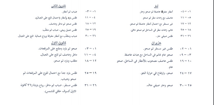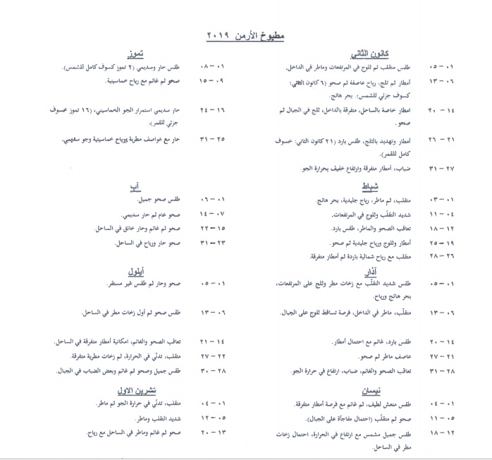وفي الصورة المرفقة، تظهر أحوال الطقس في كلّ أشهر العام 2019، حيث يبدو أنّ الأمطار سترافقنا حتّى شهر أيار، كذلك سيشهد منتصف حزيران هطول أمطار، ليشهد بعد ذلك تموز رياحًا خماسينية، وتتوقف الأمطار في آب، لتعود في أيلول.