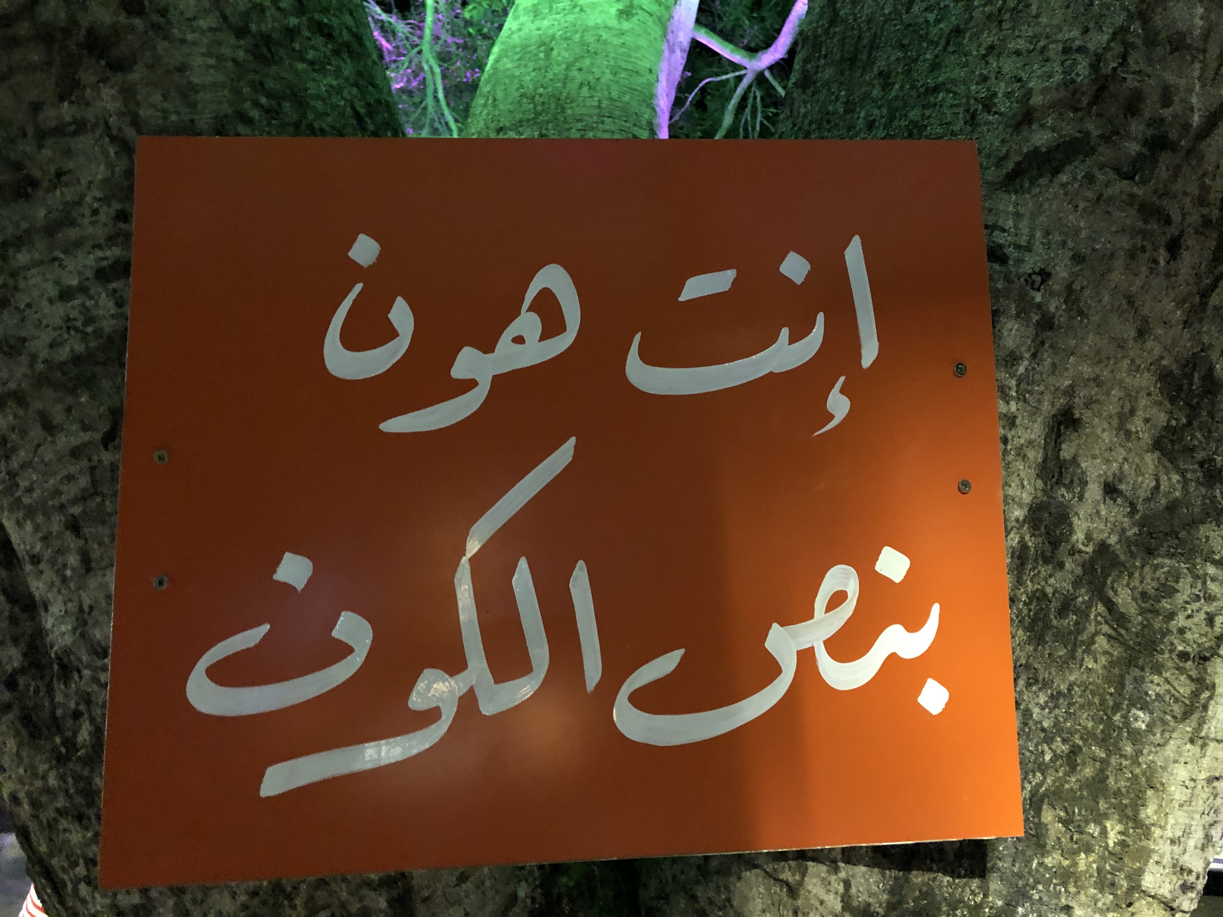 وﺑﺎﻷﺧﯾر ﺑﺗﻼﻗﻲ ﺣﺎﻟك وﺻﻠت ﻟﺳﺎﺣﺔ اﻟﺿﯾﻌﺔ وﻗﺑل ﻣﺎ ﺗﻘول ﻣﺎ ﺷﺑﻌت ﻣن ھﺎﻷﻗوال ﺑﻌد، ﺑﯾطﻠﻊ ﺑوﺟّك ﺷﺟرة ﻛﺑﯾرة وﻋﻠﻰ ﺟذﻋﮭﺎ اﻟﺿﺧم ﻟوﺣﺔ ﻣﻊ أرﺑﻊ ﻛﻠﻣﺎت ﺑﯾﻠﺧﺻوا ﻛل ﺷﻲ: “أﻧت ھون ﺑﻧص اﻟﻛون”.